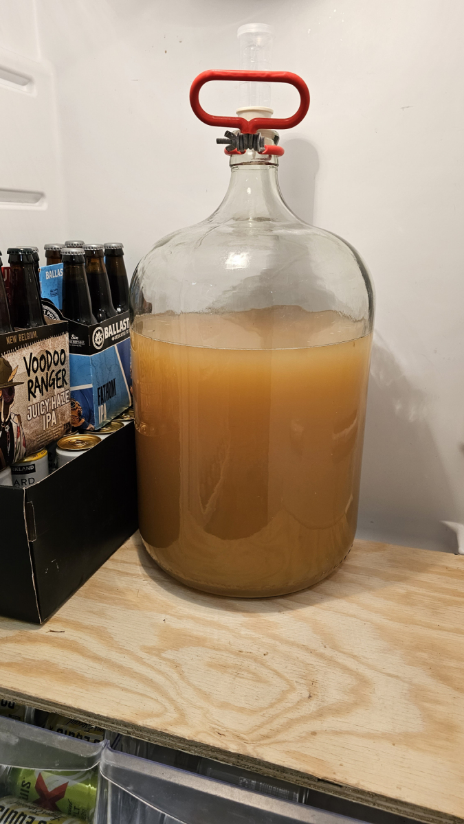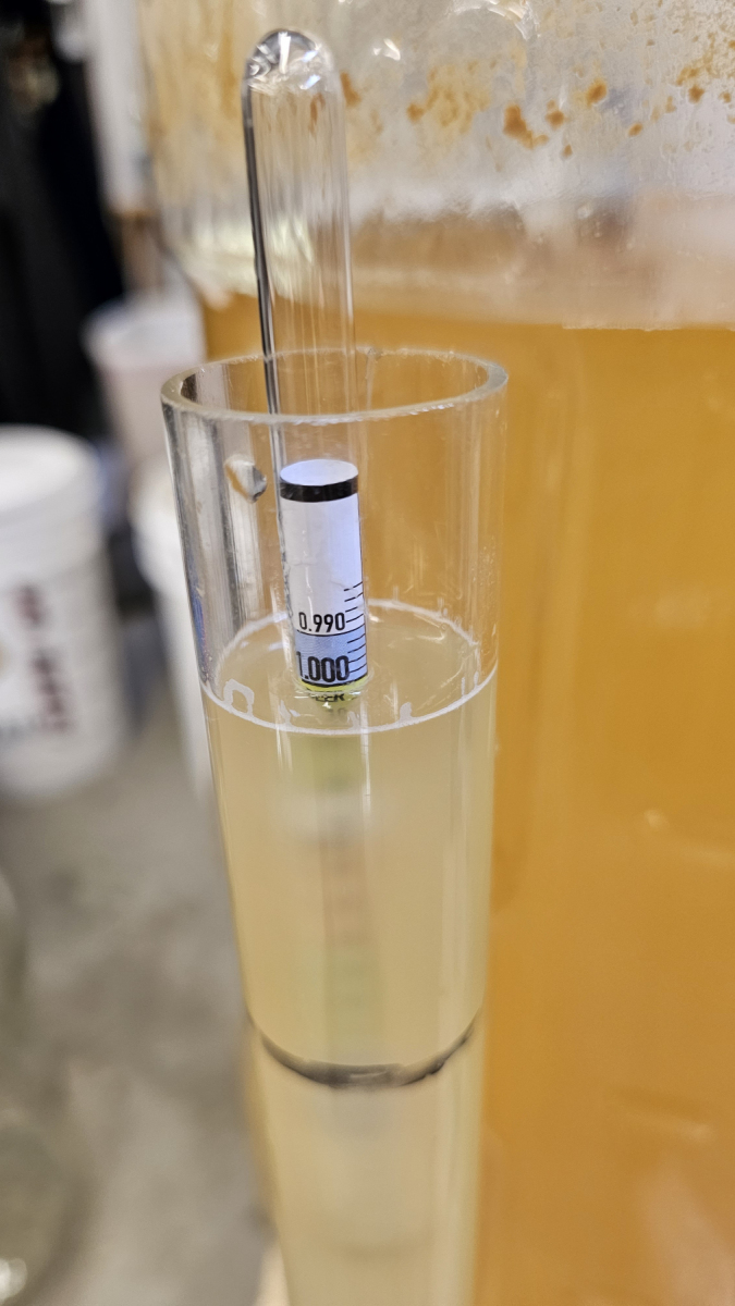 Figuring two weeks should be enough time to ferment so checked gravity and and it’s bottomed out at 1.000 giving me a final ABV of 6.5%. Aroma is on the smelly side. Not sulfur, but more like sweat sock or butyric acid (vomit). Does raise some concern as I’ve had that in my beer before – not pleasant. I did read that it sometimes happen and called “cider funk”, and should pass with time/aging. We’ll see.